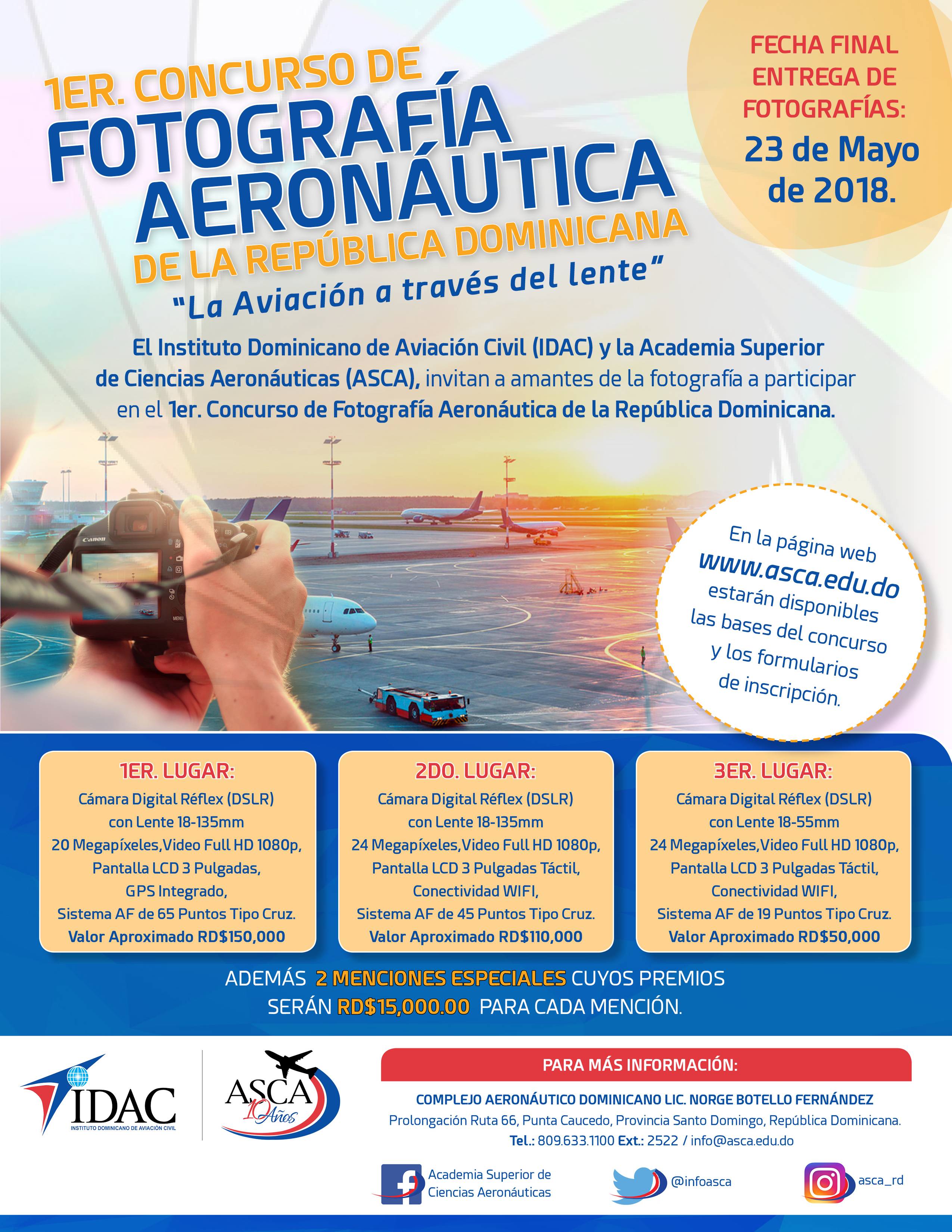 El Instituto Dominicano de Aviación Civil (IDAC) y la Academia Superior de Ciencias Aeronáutica (ASCA) informan que 1er. concurso de fotografía aeronáutica de la República Dominicana, «La aviación a través del lente», ha sido prorrogado para el 23 de mayo de 2018, fecha final en la cual serán recibidos los trabajos fotográficos: