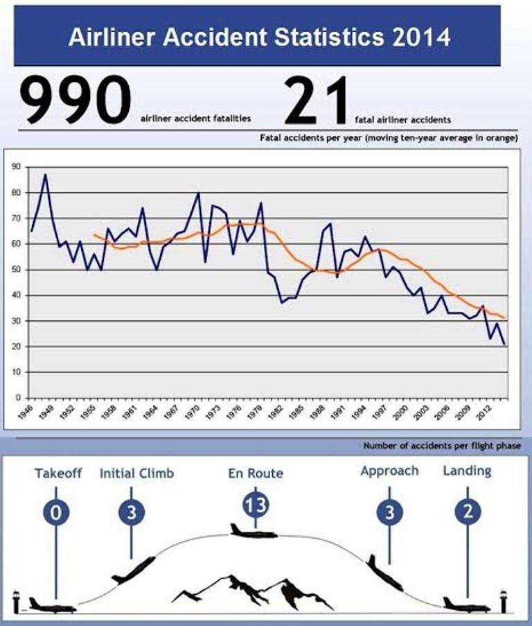 Muy a pesar de los accidentes aéreos de alto perfil que sucedieron al final del 2014, el recién concluido fue un año bastante seguro para la aviación civil, según se desprende del conteo de accidentes aéreos a nivel internacional.