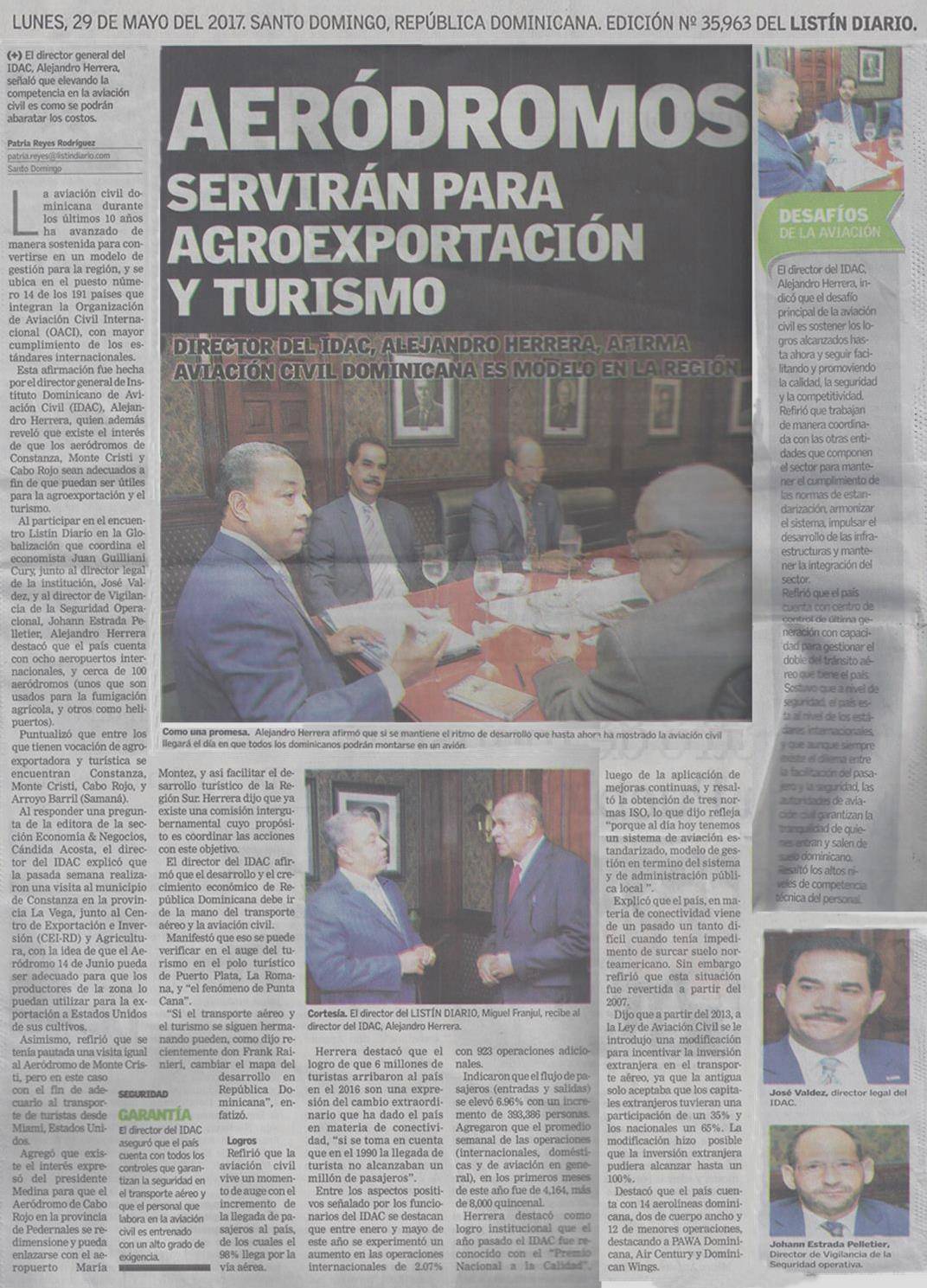 Al participar en el encuentro Listín Diario en la Globalización que coordina el economista Juan Guilliani Cury, junto al director legal de la institución, José Valdez, y al director de Vigilancia de la Seguridad Operacional, Johann Estrada Pelletier, Alejandro Herrera destacó que el país cuenta con ocho aeropuertos internacionales, y cerca de 100 aeródromos (unos que son usados para la fumigación agrícola, y otros como helipuertos).