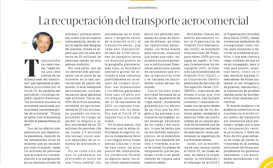 “Uno de los sectores más perjudicado con el cierre de las fronteras en la casi universalidad de países del mundo es el transporte aerocomercial, cuya paralización igual generará más pobreza”, apunta Herrera en un artículo publicado en el Listin Diario y en el portal del IDAC.