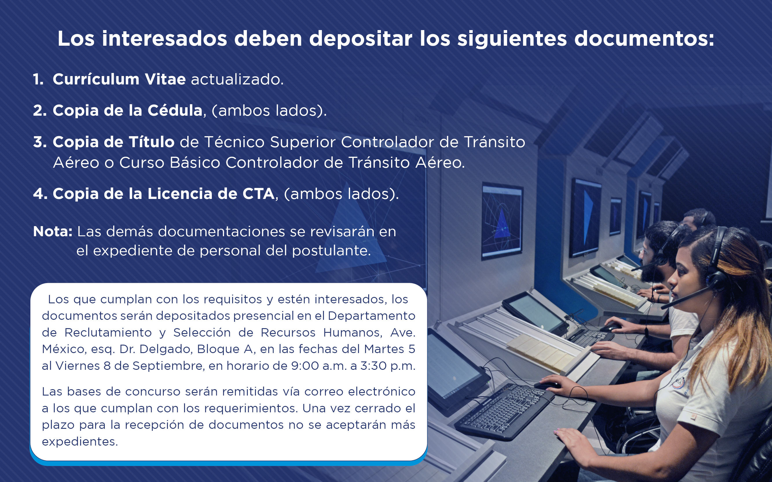 Se les informa que los que cumplan con los requisitos y estén interesados, los documentos serán depositados presencial en el Departamento de Reclutamiento y Selección de Recursos Humanos, Ave. México, esq. Dr. Delgado, Bloque A, en las fechas del Martes 5 al Viernes 8 de Septiembre, en horario de 9:00 a. m. a 3: 30 p. m.