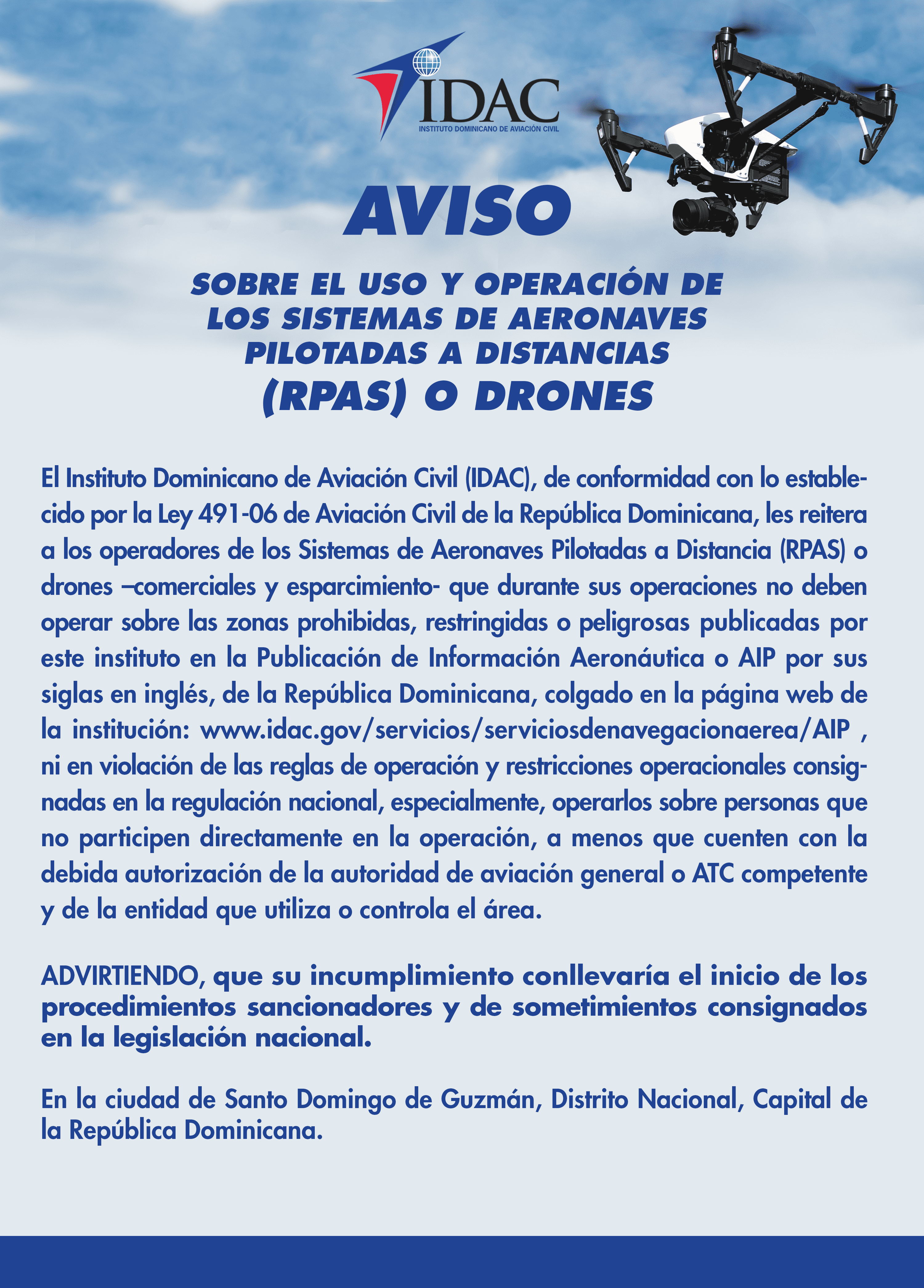 Aviso sobre el uso y operación de Aeronaves pilotadas a distancia (RPAS) o drones julio 1, 2019 Dirección de Comunicaciones - Avisos