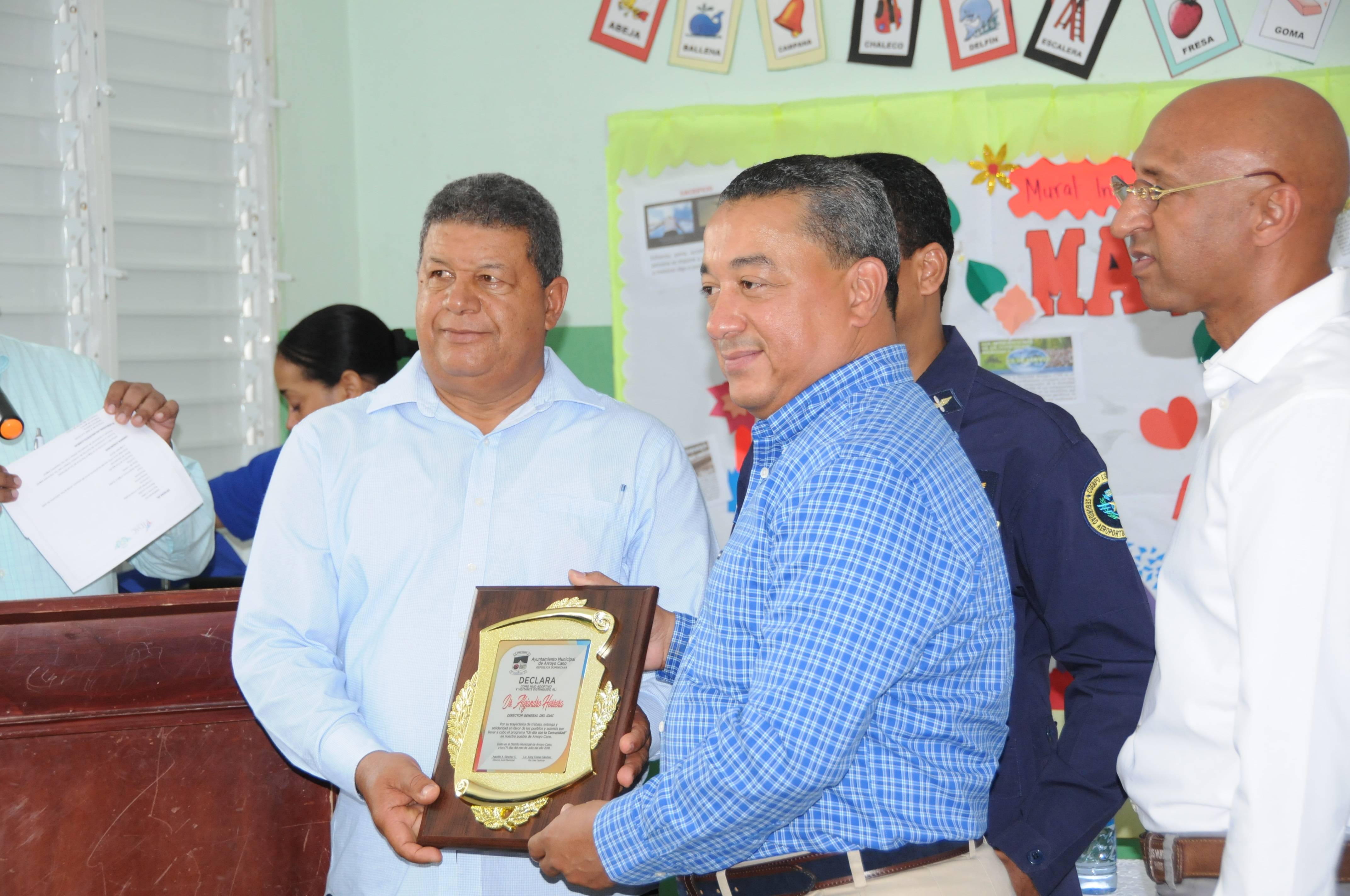 El director general del IDAC recibe una placa de reconocimiento de parte de las autoridades de Arroyo Cano.