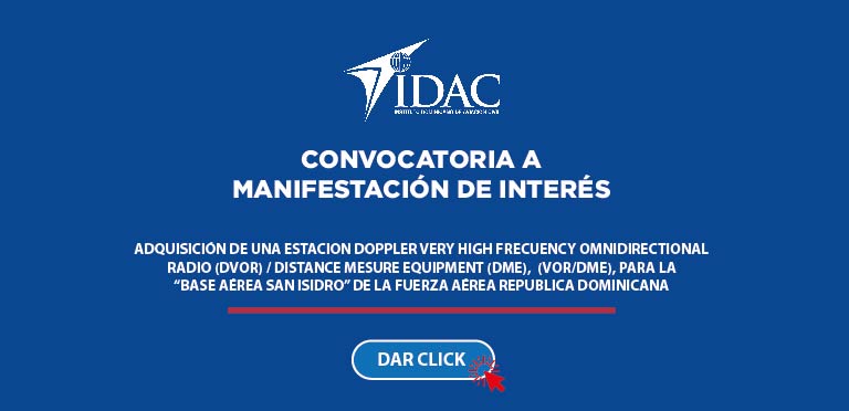 El Instituto Dominicano de Aviación Civil Idac, invita a oferentes nacionales o con representación en el territorio nacional, a manifestar su interés en participar en el proceso que llevaremos a cabo más adelante, para proveer una estación Doppler Very High Frecuency Omnidirectional Radio (DVOR) /Distance Mesure Equipment (DME), (VOR/DME), para la «Base Aérea San Isidro» de la Fuerza Aérea República Dominicana.