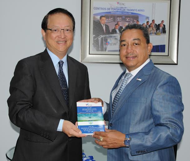 El doctor Alejandro Herrera, director general del Instituto Dominicano de Aviación Civil (IDAC), hace entrega del compendio de leyes de la aviación civil a Valentino Ji Zen Tang, embajador de la República de China (Taiwán) en República Dominicana.