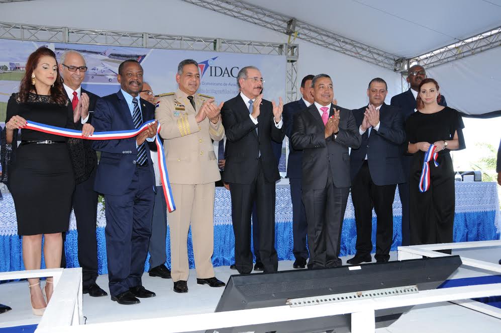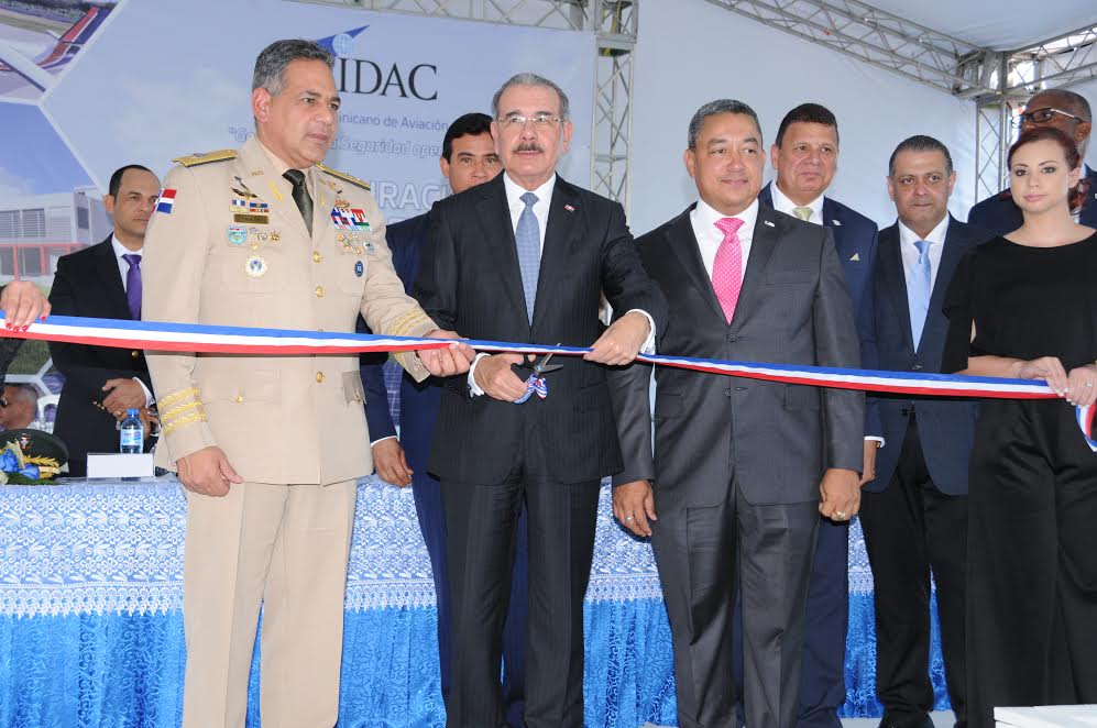 El Presidente Danilo Medina, luego de las palabras del director del IDAC, paso al frente de la Mesa, procediendo al corte de la cinta con las que formalmente quedaron inauguradas las edificaciones a inaugurarse que se han tipificado como “obras complementarias” una planta fotovoltaica que genera mil kilovatios de electricidad, la ampliación de aulas y oficinas de la Academia Superior de Ciencias Aeronáuticas (ASCA), el Consultorio Técnico de Medicina Aeronáutica, la residencia militar, una cancha deportiva, una plataforma de exhibición de dos aeronaves para la enseñanza, un helipuerto y una plaza en honor al primer director del IDAC, Norge Botello, quien ha sido declarado “Gestor de la Nueva Etapa de Aviación Civil Dominicana”.