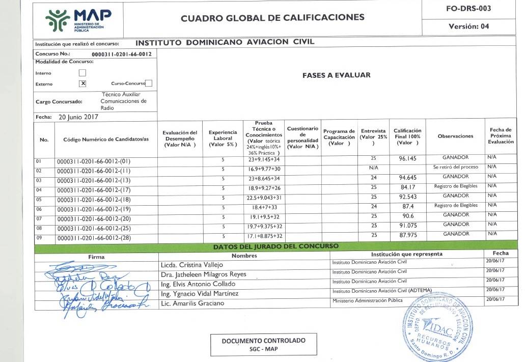 El Instituto Dominicano de Aviación Civil (IDAC), a través de su Dirección de Recursos Humanos (DRH) presenta el Listado Global de Calificaciones presentado por el Ministerio de Administración Pública (MAP), en el que participaron varios miembros de esta institución. A continuación el listado que pueden descargar a través del enlace más abajo suministrado.