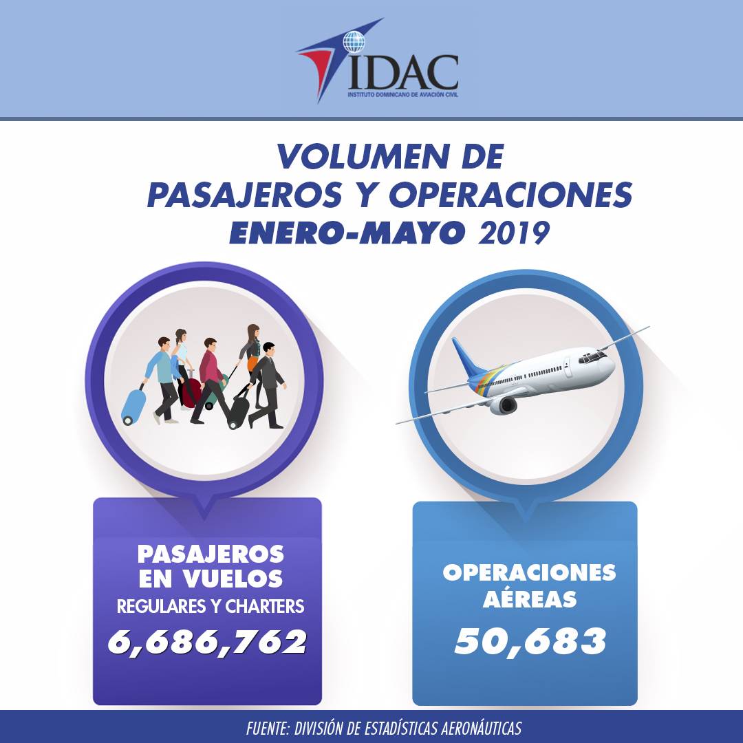 Un despacho de la Dirección de Comunicaciones y Relaciones Públicas del IDAC, que da a conocer las estadísticas de los primeros cinco meses de 2019 atribuye a la confianza del sector aeronáutico nacional y de las líneas aéreas internacionales para operar de manera efectiva, segura y apegados a las normativas internacionales, el crecimiento sostenido en las operaciones y en el volumen de pasajeros transportado tanto los que salen como los que entran al país.