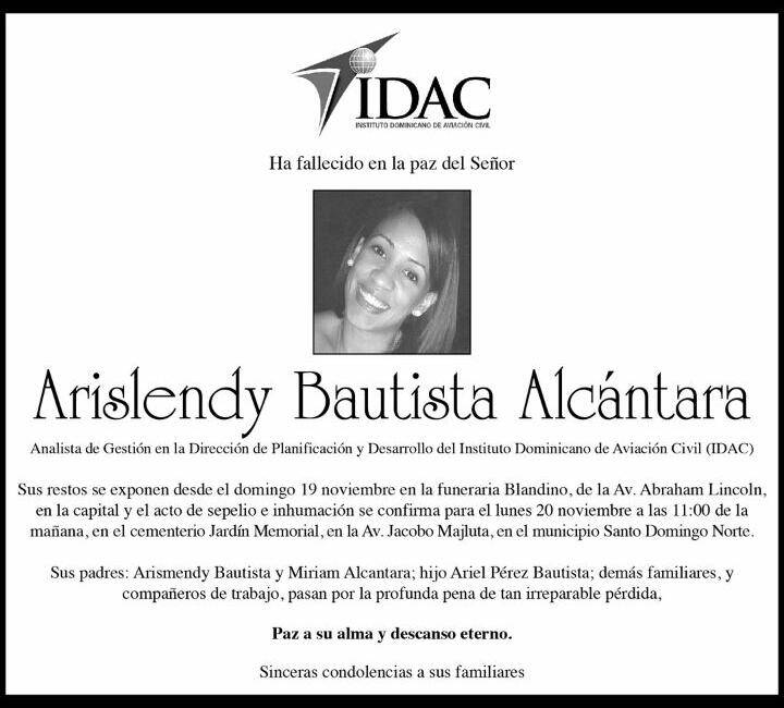 Santo Domingo.-Con gran pesar el Instituto Dominicano de Aviación Civil (IDAC) confirmó el sentido fallecimiento de Arislendy Bautista Alcántara, quien desempeñaba las funciones de analista de gestión en la Dirección de Planificación y Desarrollo de esta institución.