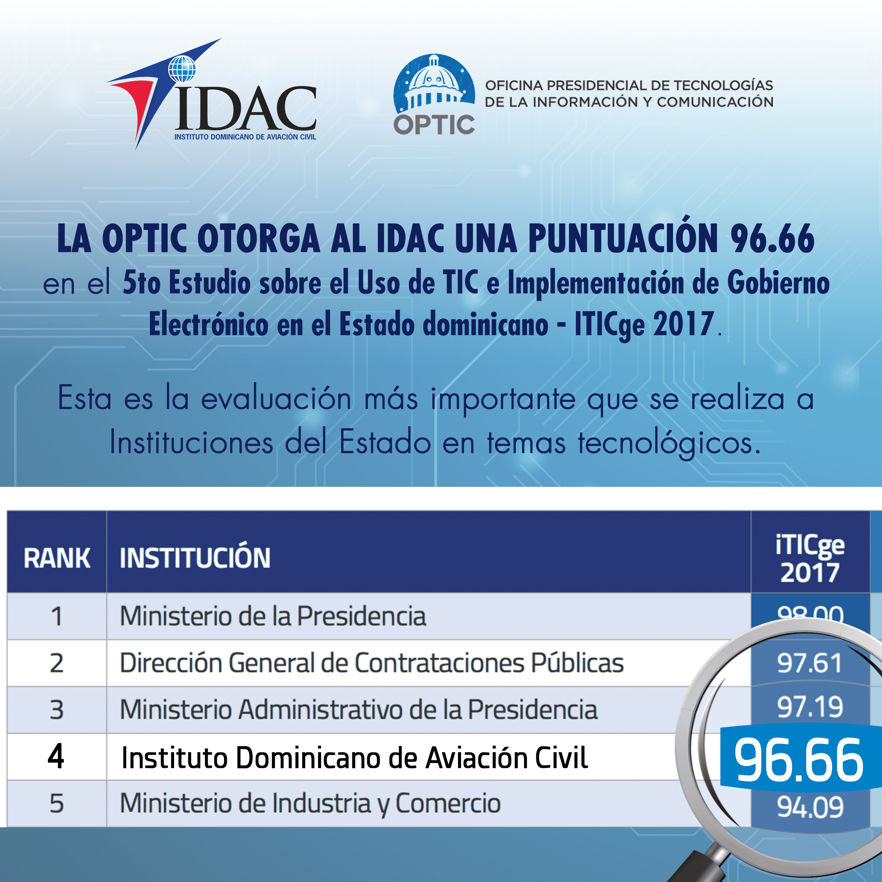 Santo Domingo.- El Instituto Dominicano de Aviación Civil (IDAC) acumuló 96.66 por ciento en el “ranking” de las instituciones oficiales que mejor utilizan las Tecnologías de la Información y Comunicación (TIC) e implementan el Gobierno Electrónico en el Estado, colocándose en la cuarta posición entre más de 200 entidades evaluadas en la medición que anualmente lleva a cabo la Oficina Presidencial de la Tecnología de la Información y Comunicación (OPTIC).