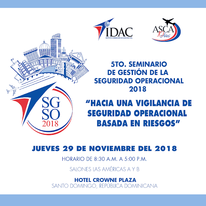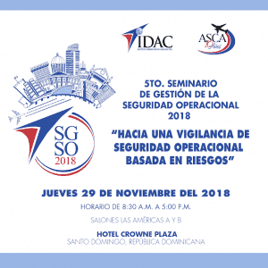 Santo Domingo.- El Instituto Dominicano de Aviación Civil (IDAC) celebrará este jueves el quinto seminario sobre Seguridad Operacional SGSO 2018, esta vez con el título “Hacia una vigilancia de seguridad operacional basada en riesgos.”