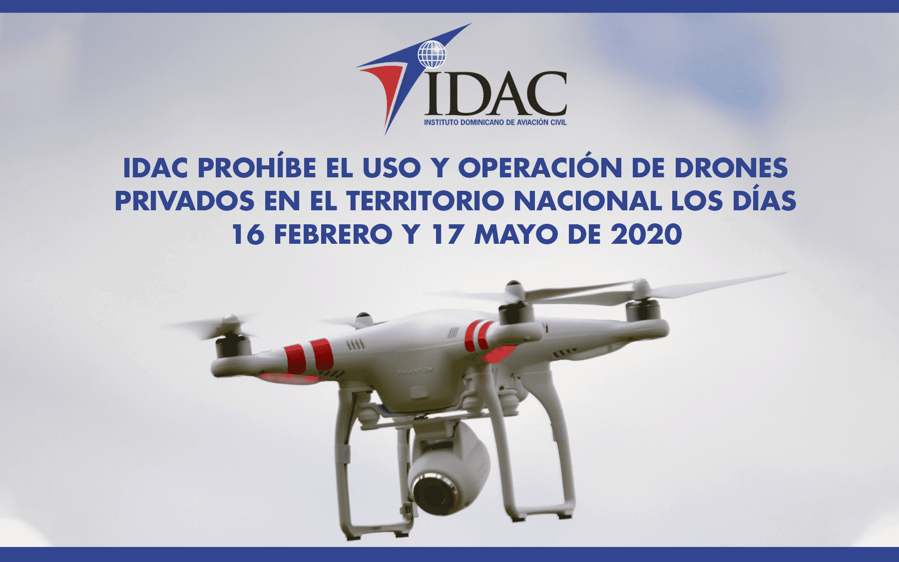 Santo Domingo.- El Instituto Dominicano de Aviación Civil (IDAC) informa que ha emitido la resolución No. 002/2020, mediante la cual prohíbe el uso y operación de aeronaves pilotadas a distancia (RPAS o drones) los días 16 de febrero y 17 de mayo de 2020 en todo el territorio y espacio aéreo nacional, desde las 6:00 am hasta las 6:00 pm.