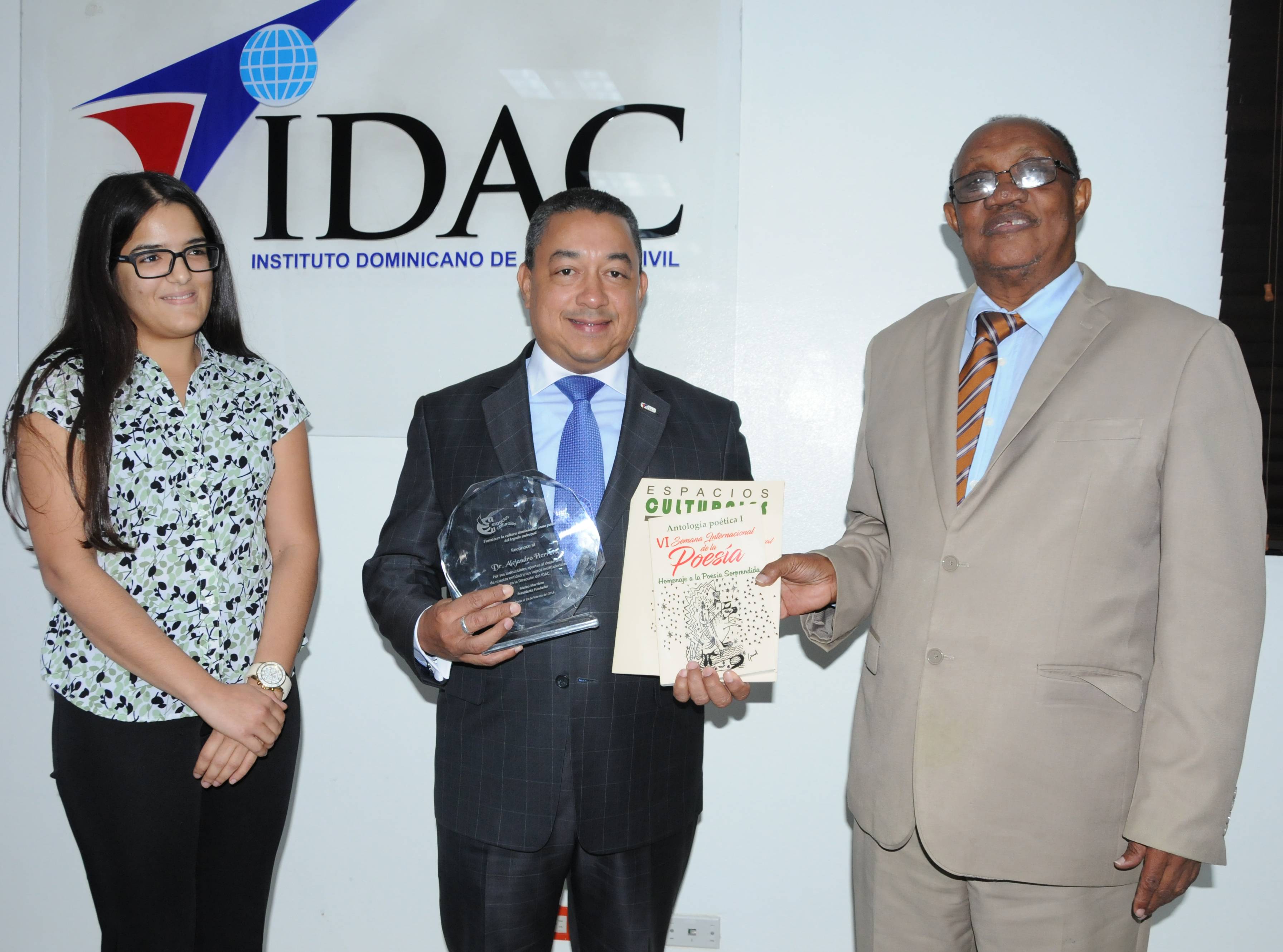 Santo Domingo.- El director general del Instituto Dominicano de Aviación Civil, Dr. Alejandro Herrera, recibió el reconocimiento que otorga la Fundación Espacios Culturales, por sus demostradas cualidades como modelo de funcionario del Estado, por los aportes a la cultura y el apoyo a los autores dominicanos.