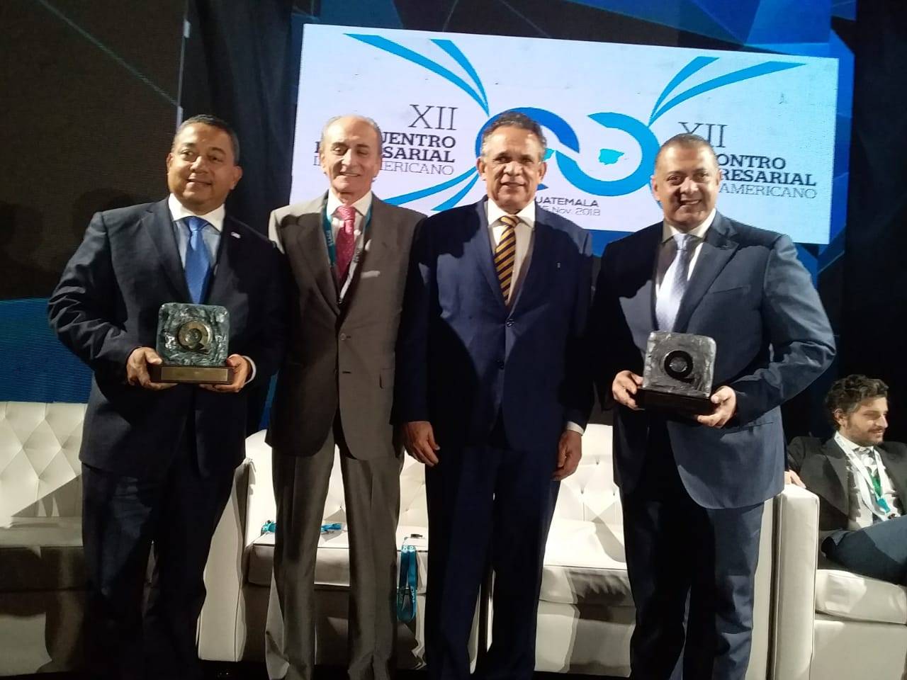 El director general del IDAC, Dr. Alejandro Herrera y Luis Ernesto Camilo, presidente de la Junta de Aviación Civil (JAC), exhiben premio Iberoamericano de la Calidad, junto a Martín Cuesta, director ejecutivo de la Fundación Iberoamericana para la Gestión de la Calidad (FUNDIBEQ) y Ramón Ventura Camejo, Ministro de la Administración Pública (MAP), en la XI Semana de la Calidad.