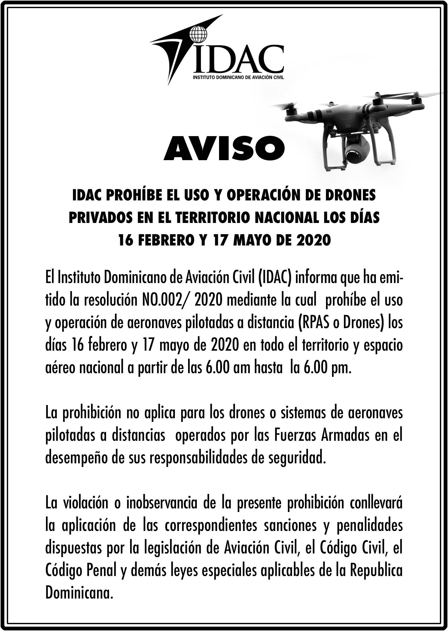 IDAC prohíbe uso y operación de drones privados en RD días 16 febrero y 17 de mayo 2020 febrero 12, 2020 Dirección de Comunicaciones - Noticias