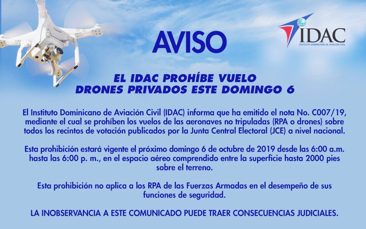El Instituto Dominicano de Aviación Civil (IDAC) informa que ha emitido el notam No. C007/19, mediante el cual se prohíben los vuelos de las aeronaves no tripuladas (RPA o drones) sobre todos los recintos de votación publicados por la Junta Central Electoral (JCE) a nivel nacional.