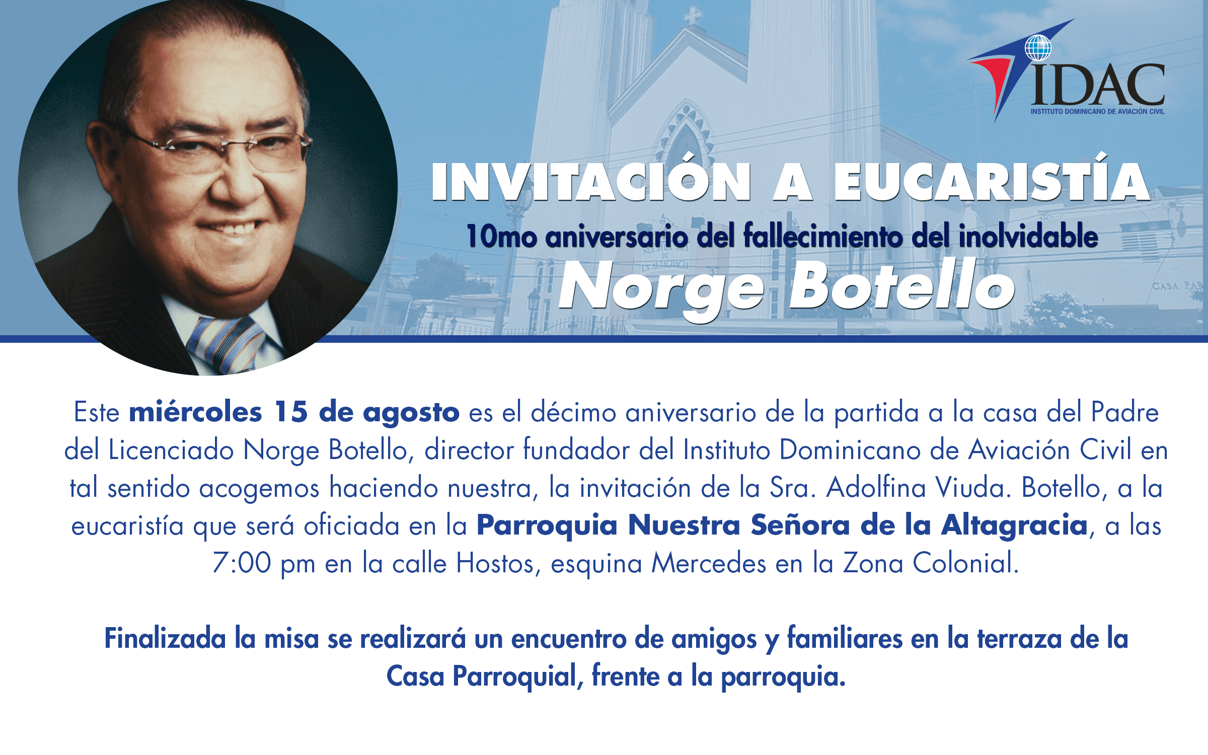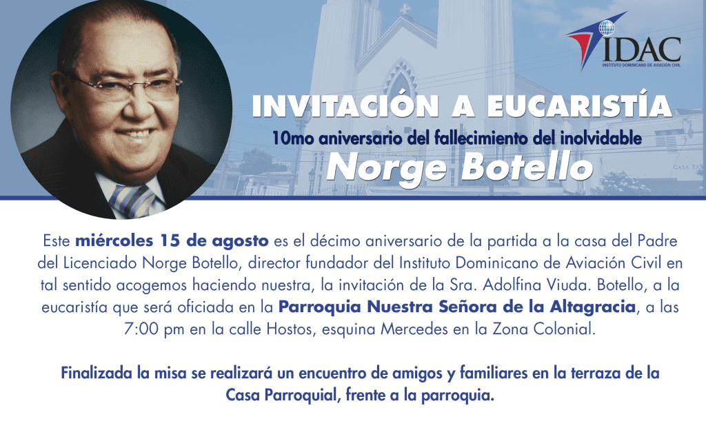 Este miércoles 15 de agosto es el décimo aniversario de la partida a la casa del Padre del Licenciado Norge Botello, director fundador del Instituto Dominicano de Aviación Civil (IDAC) en tal sentido acogemos haciendo nuestra, la invitación de la Sra. Adolfina Viuda. Botello, a la eucaristía que será oficiada en la Parroquia Nuestra Señora de la Altagracia, a las 7:00 pm en la calle Hostos, esquina Mercedes en la Zona Colonial.