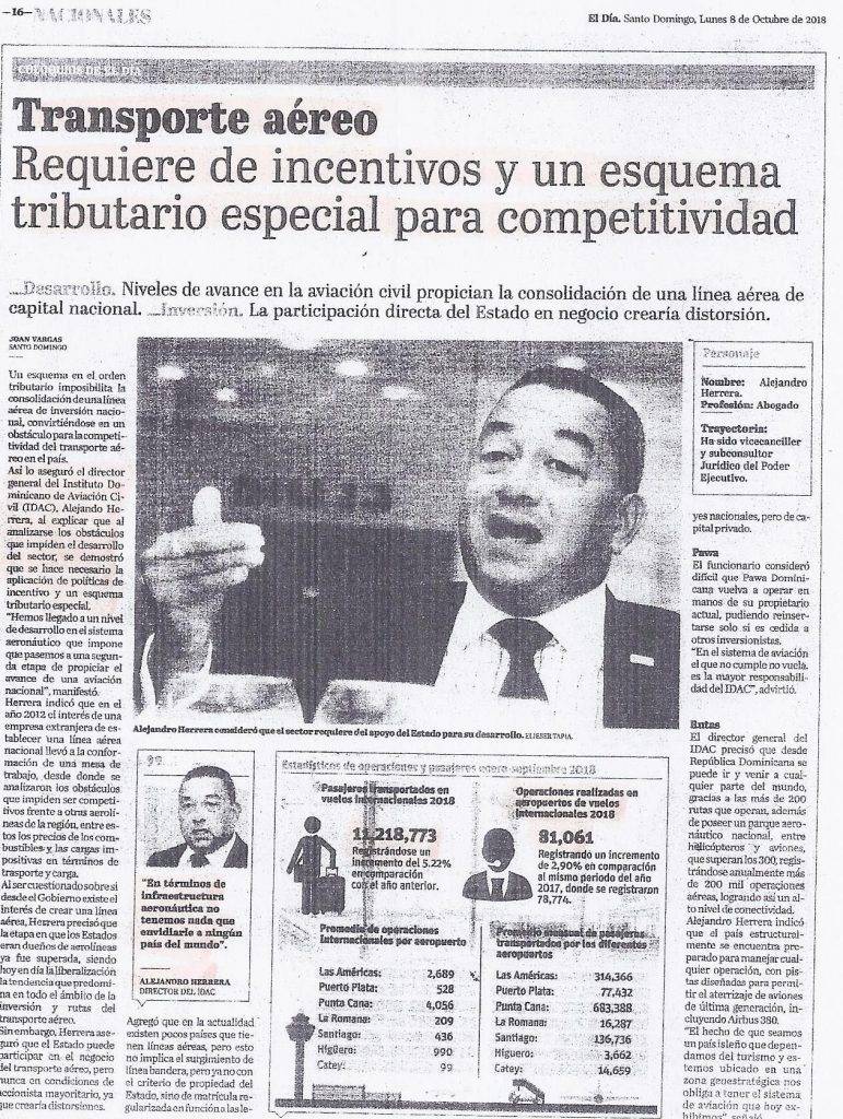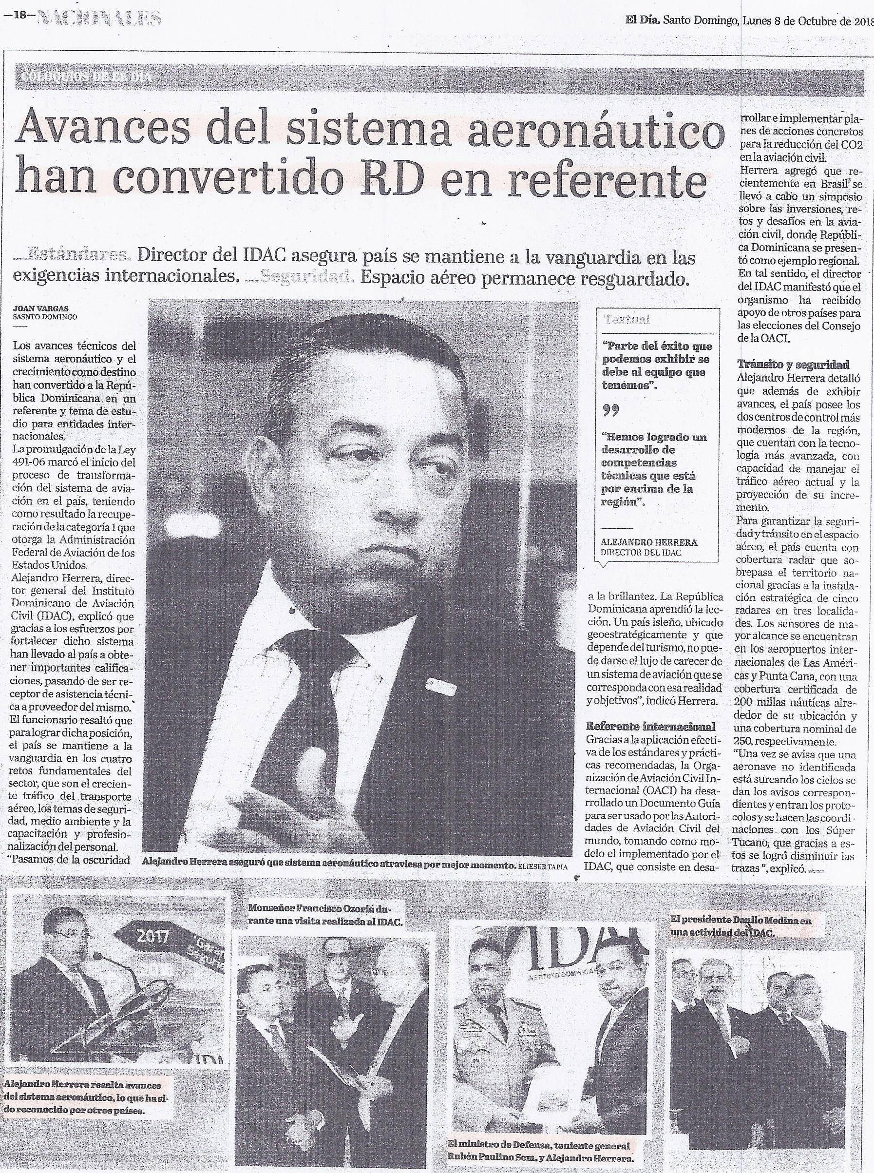 Los avances técnicos del sistema aeronáutico y el crecimiento como destino han convertido a la República Dominicana en un referente y tema de estudio para entidades internacionales, explicó Alejandro Herrera director del IDAC en una entrevista al periódico El Día.