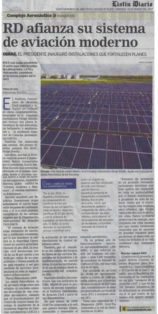 Con el título: “RD afianza su sistema de aviación moderno” el Listín Diario en su edición dominical reseñó el acto inaugural de las obras complementarias del Complejo Aeronáutico Norge Botello a la que asistió el Presidente de la República, Danilo Medina.